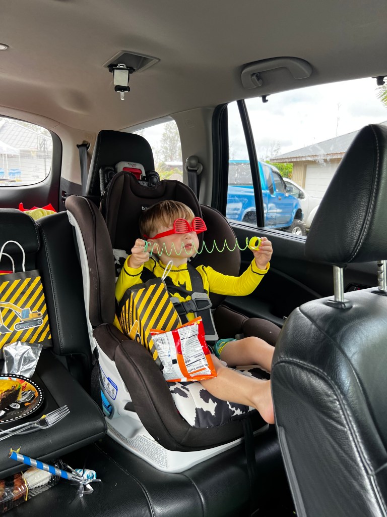 After all of the frolicking and fun, the kids were given a bag of party favors and everyone went their respective ways. And that is where we get our title. My daughter send me this picture along with the message “Cam is in his own world”.