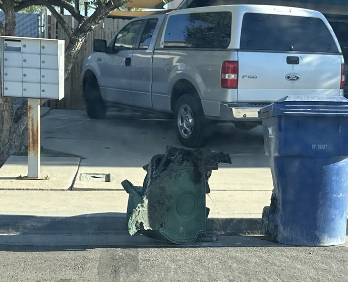 I went over to ask if they were in charge of the smoke. Their puzzled look on their faces let me know that this was a problem. As it turns out, a rag with tung oil on it had been thrown out and it spontaneously combusted. After we put out the fire using a hose and two fire extinguishers, we noticed that one plastic trash can was melted down to about 1 foot high and the other had a hole melted in the bottom. The two propane tanks right next to the trash cans were unharmed.
